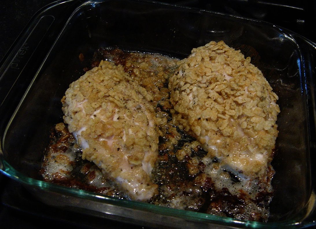 I made this for my grandsons, thinking that anything with rice crispy's would be loved by kids--and this was, although it is really a very sophisticated tasting chicken dish. Your are supposed to slightly crush the cereal, but I forgot to..I spread the crispy's along with the flour and seasonings on a tray to mix and coat my raw chicken it.